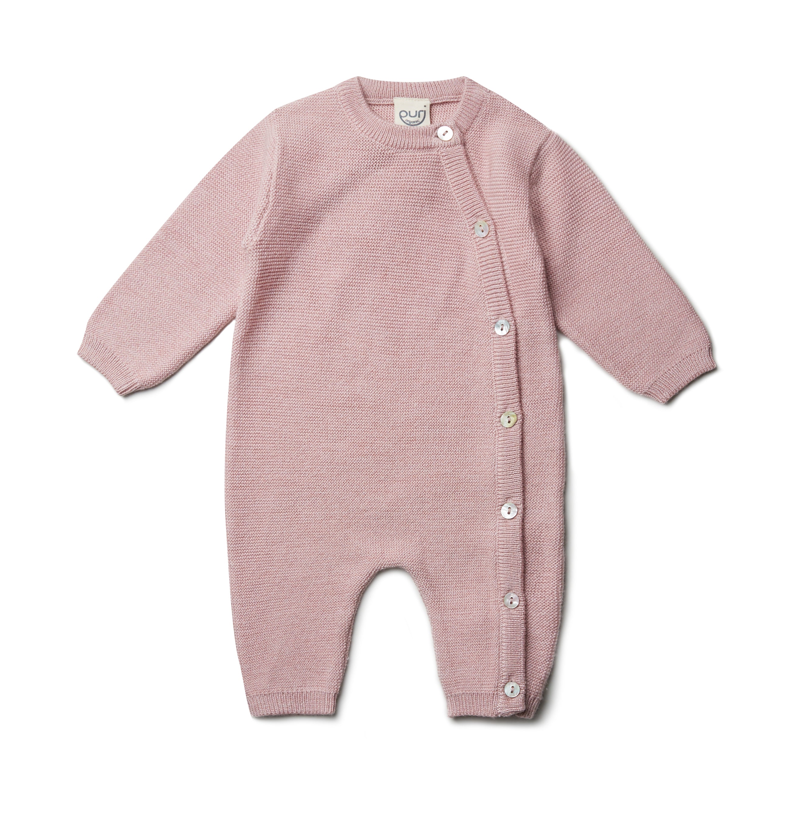 Merinowolle/Seide Strickoverall. Hochwertiger, weicher und formstabiler Krausstrick. Mit durchgehender Knopfleiste zum einfachen An- und Ausziehen. Feine Merinowolle aus nachhaltiger Tierhaltung, mulesing frei, gemischt mit weicher Seide.