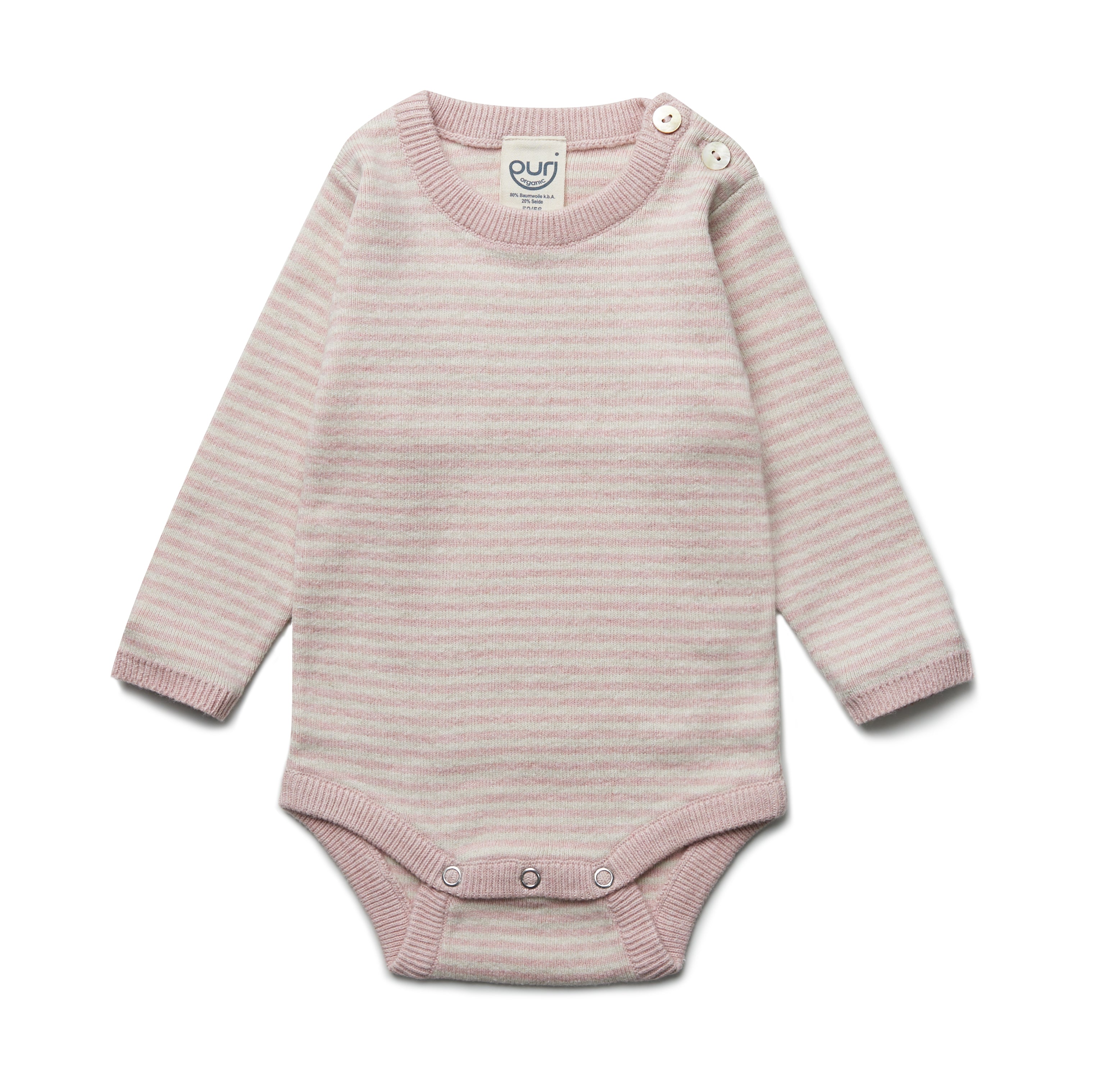 Biobaumwolle/Seide Strickbody. Feiner, anschmiegsamer und formstabiler Rippenstrick. Perlmuttknöpfe an Schulter, nickelfreie Druckknöpfe unten. Für jede Jahreszeit geeignet.