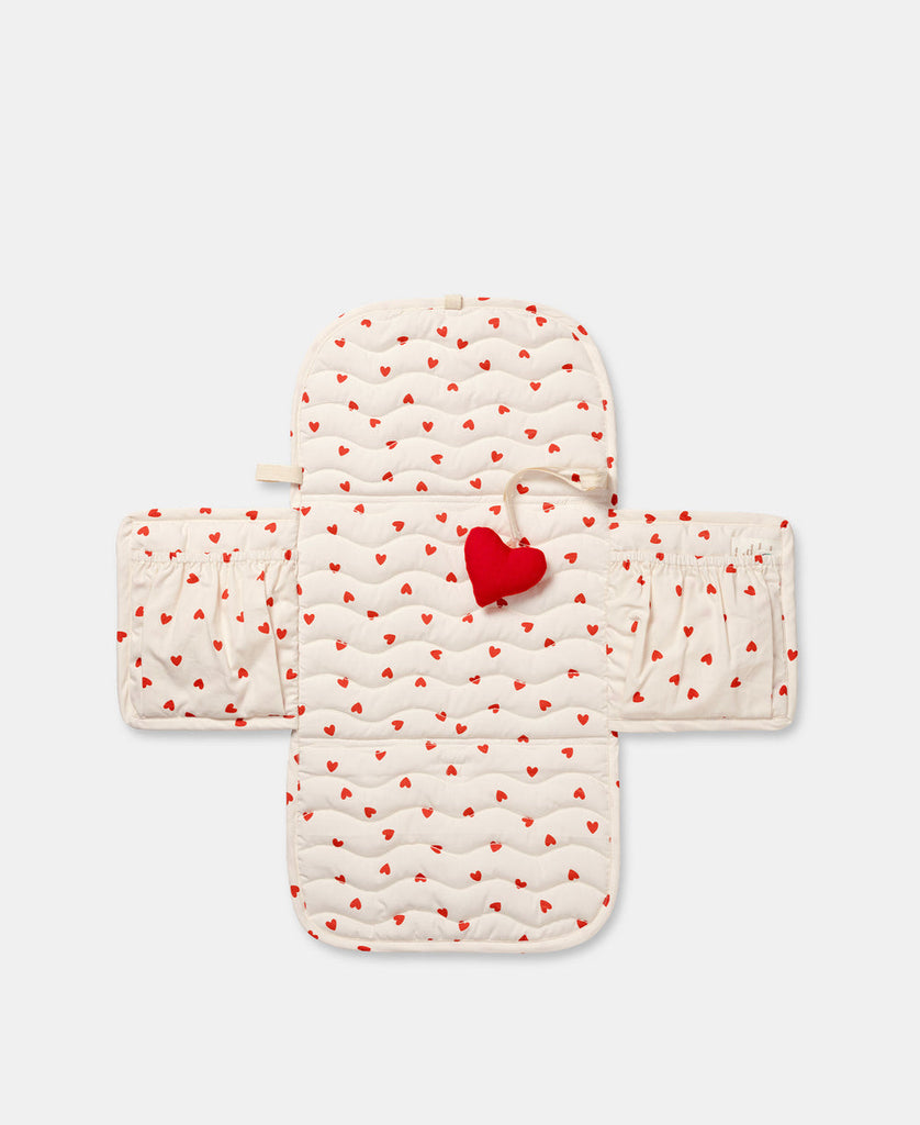 Ein stilvolles und praktisches Must-have für Familien unterwegs. Die Wickelunterlage ist leicht, lässt sich einfach zusammenfalten und mit einem kleinen Band fixieren. Das durchdachte, schlichte Design bietet zwei Taschen für Windeln, Kleidung und kleine Utensilien – alles Wichtige immer griffbereit. Ein süßes, herzförmiges Spielzeug sorgt dafür, dass die kleinen Hände beim Wickeln etwas zum Greifen und Trösten haben.