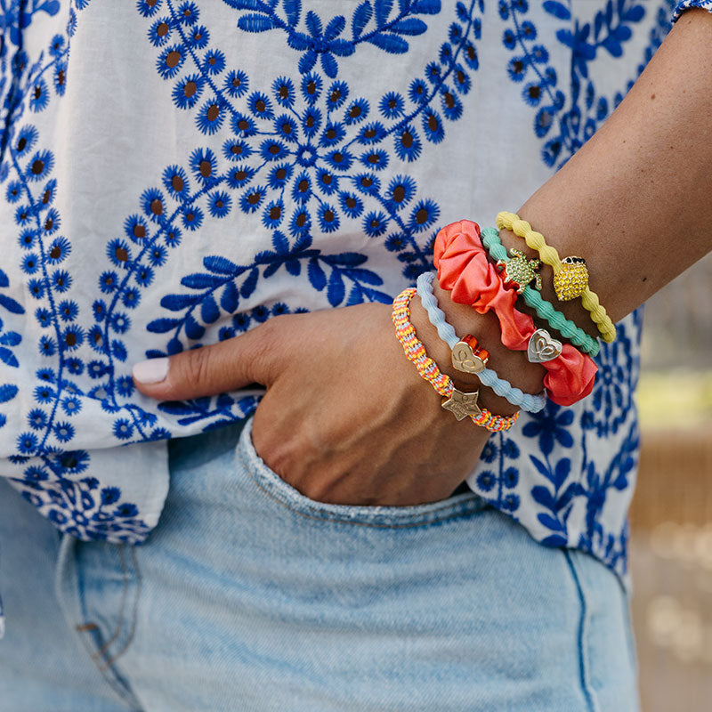 The box is filled with five pretty Bangle Bands - Turtle Jungle Green, Silver Heart Silk Neon Peach, Lemon Sunshine Yellow, Metallic Gold Star Tropicana and Gold Heart Sky Blue