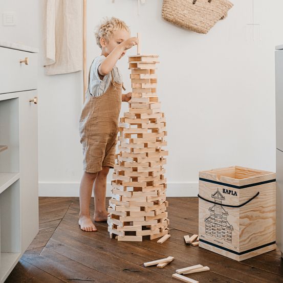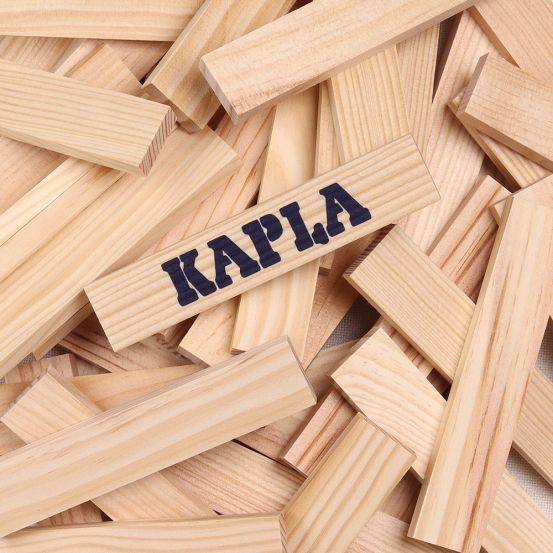 Der Kasten enthält 280 identische, naturbelassene KAPLA-Holzplättchen, die nur den eigenen Ideen folgend, ohne jede Befestigung, aufeinandergestapelt werden.