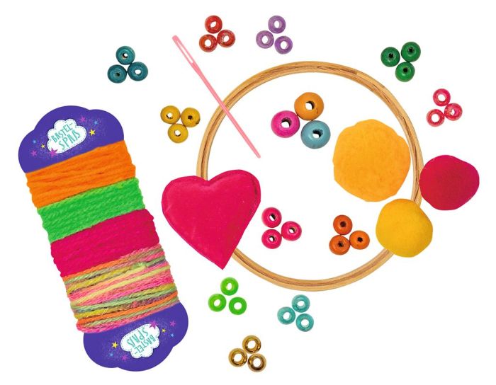 Das Set enthält einen runden Holzrahmen, Garn in verschiedenen Farben, Perlen, Pompoms, ein wattiertes Stoffherz und weiteres Zubehör. Die beiliegende Anleitung macht das Basteln zu einem einfachen und kreativen Erlebnis – ideal für Kinder ab 6 Jahren.