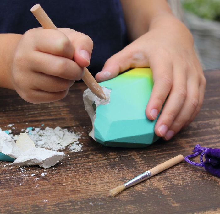 In jedem bunten Gips-Edelstein verbirgt sich ein schimmernder Glücksstein (Quarz), der mit dem beiliegenden Werkzeug selbst freigelegt werden kann. Einfach ausgraben, abpinseln und staunen!
