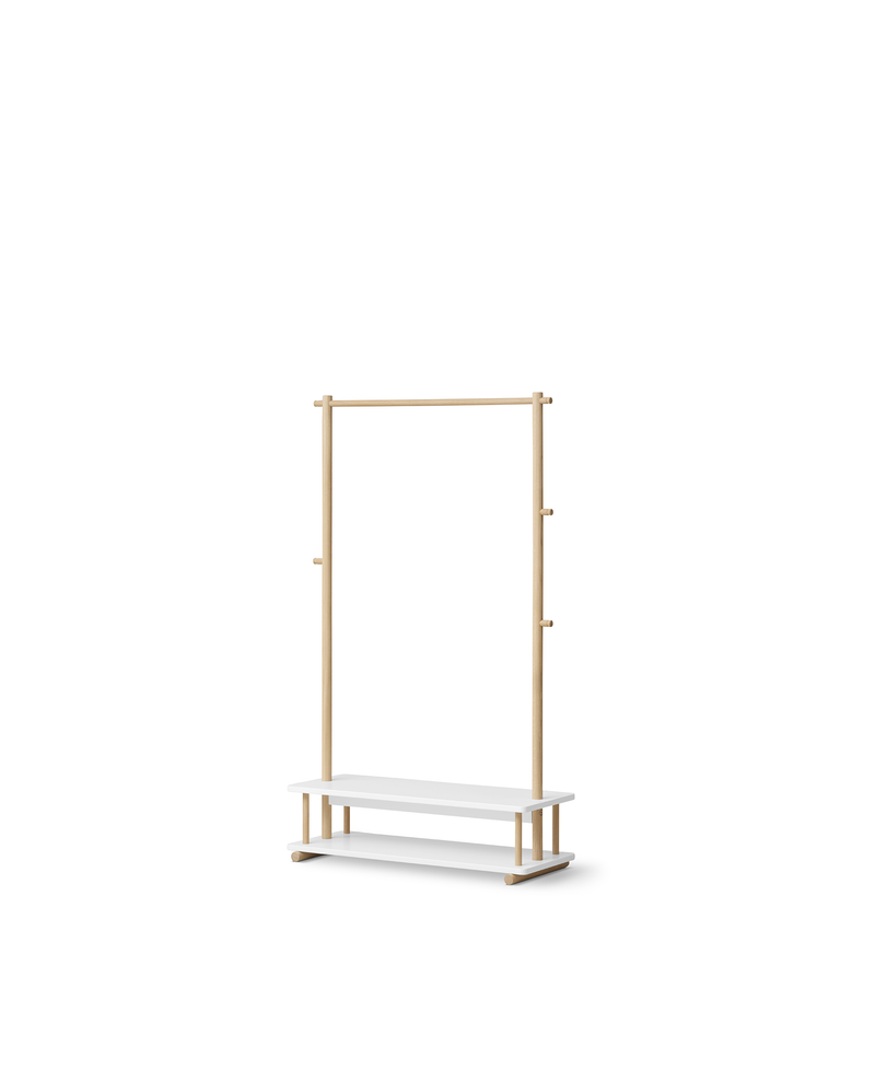 Der Kleiderständer besteht aus massiver, weiß geölter Eiche mit einer Tischplatte aus MDF, einem Holzwerkstoff, der zu 60 % aus Birke, 20 % aus Kiefer und 20 % aus Espe besteht. MDF ist sehr robust und langlebig.