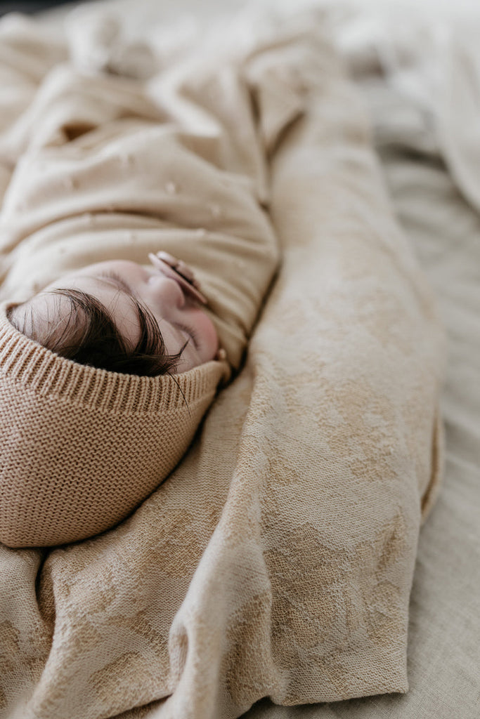 Eine nahtlose Mütze aus 100 % Merinowolle, die eine Mischung aus Weichheit und Wärme bietet. Mitteldick und vielseitig einsetzbar – ideal, um Ihr Kleines drinnen und draußen kuschelig warm zu halten.