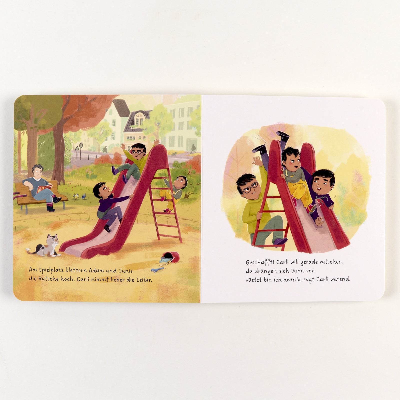 Carli und Klecks sind auf dem Spielplatz, aber die Rutsche ist ständig besetzt und es ist alles ein bisschen zu wild. Da gehen die beiden lieber in den Garten von Nachbarin und Ersatzoma Inge und bauen sich eine ganz besondere eigene Rutsche!