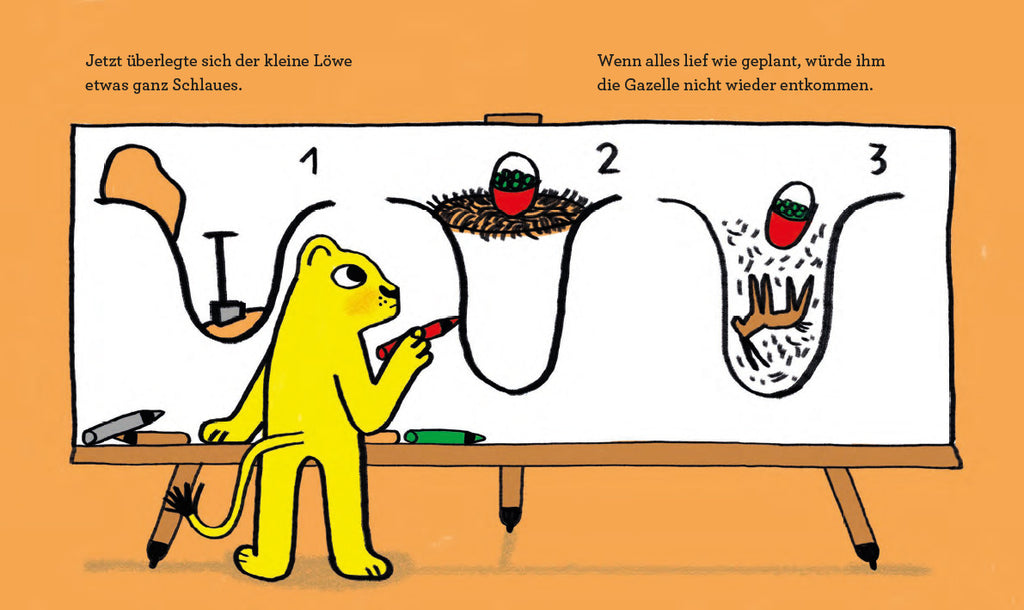 Papa Löwe findet, der kleine Löwe solle nun endlich seine erste Gazelle fangen. Doch der Weg dahin ist beschwerlich. Der kleine Löwe macht einen Fehler nach dem anderen: Viel zu selbstsicher geht er es beim ersten Mal an – und scheitert. Beim zweiten Mal ist er nicht schnell, beim dritten Mal nicht schlau genug. Nicht einmal, wenn er »Bitte« sagt, kommt er weiter und muss sogar aushalten, dass sich eine ganze Gazellenherde über ihn amüsiert. Wie es dem kleinen Löwen schließlich doch gelingt, die Gazelle zu fangen und in sein Versteck zu schleppen, ist überraschend – aber noch viel überraschender ist, was er dann zu ihr sagt.